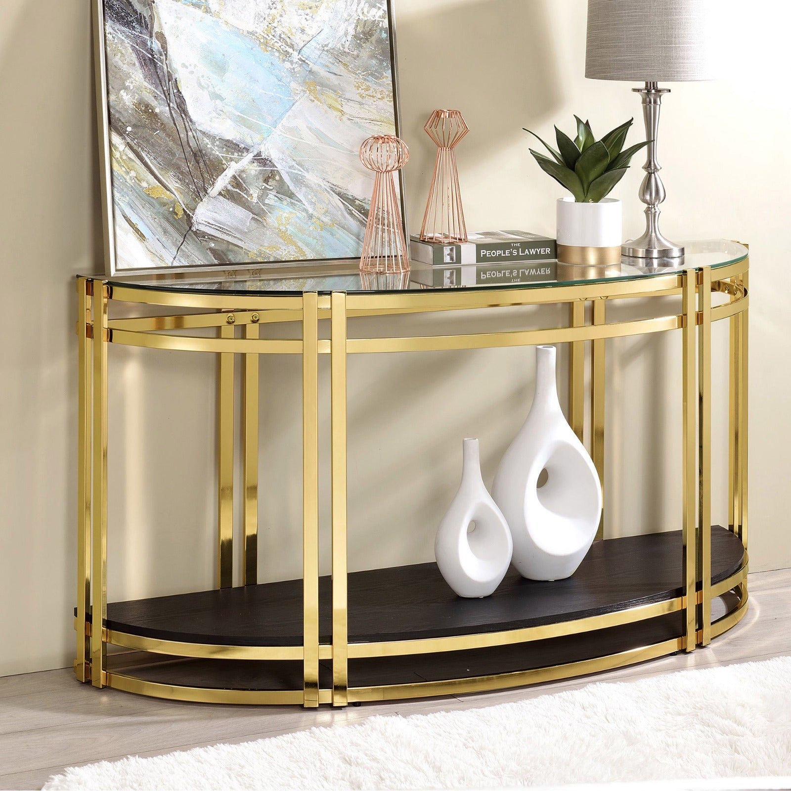 Product Details Warm tones and opulent materials come together in this contemporary modern console table. Additional Info: Exquisite and supremely elegant, this modern glam console table elevates foyers and interiors into a chic, refined space. A demilune metal frame in a gleaming gold finish accented with a black mdf bottom shelf lends a luxurious touch and elegance. A glass top opens up a tablescape, further pushing the sleek elements and creating a regal tablescape setting.